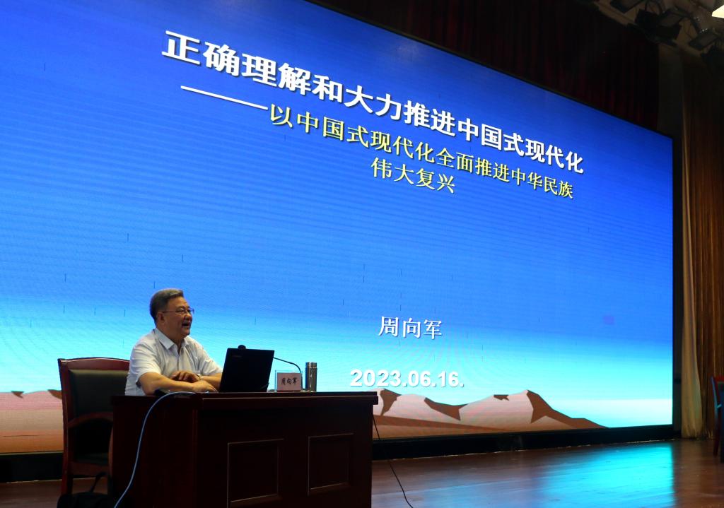 本次读书班邀请山东大学马克思主义研究院名誉院长周向军教授作题为《正确理解和大力推进中国式现代化——以中国式现代化全面推进中华民族伟大复兴》的辅导报告。报告从中国式现代化是我们党领导人民长期探索和实践的重大成果、充分认识和把握中国式现代化实践创新的重大成就、全面认识和把握中国式现代化的世界意义、系统完整准确地理解和把握中国式现代化理论、在以中国式现代化全面推进中华民族伟大复兴的伟大实践中建功立业五个方面系统阐述了中国式现代化的重要意义、理论体系和实施路径,有助于广大党员干部深刻领会本专题的学习内容。