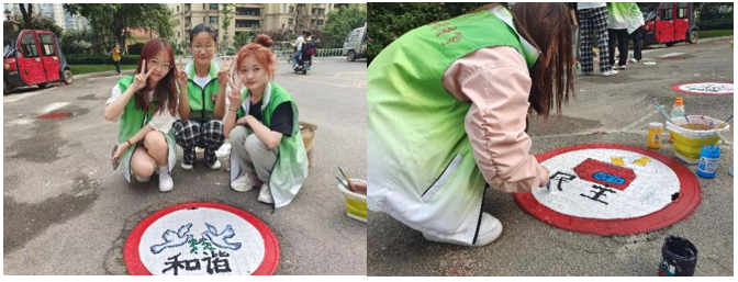 6月15日,艺术设计学院学生党支部联合恒大绿洲第三社区开展“手绘井盖促文明”实践活动。党员们积极响应,发挥专业特长,围绕社会主义核心价值观、中华民族优良传统、公益、环保等主题进行彩绘创作,让社区井盖成为一道靓丽风“井”,不仅美化了社区环境,更让新时代精神文明充满社区。彩绘作品被大批社区居民围观,获得一致好评。