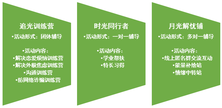 追光训练营。主要针对有拓展生活娱乐交际场域需求,同时在人际沟通能力、情感维持能力、安全意识等方面有提升需要的学生。训练营采用团体辅导的形式,发起人为辅导员,通过招募的形式在学生中招募训练营的营主,营主在辅导员的帮助指导下,根据本训练营的聚焦主题统筹训练营的整个训练计划,由参加训练营的同学共同完成训练。