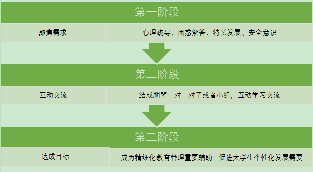 时光同行者。主要针对有个性化发展需求的学生,指导内容涵盖专业特长、能力提升、运动健康、仪容仪表等多个方面。分别在学生中招募有在某一方面提升意愿的学弟学妹以及在某一方面有所专长的学长学姐,根据上交的报名表进行匹配。参与双方就学习或者提升的内容制定授课计划,按照授课计划完成既定任务目标。